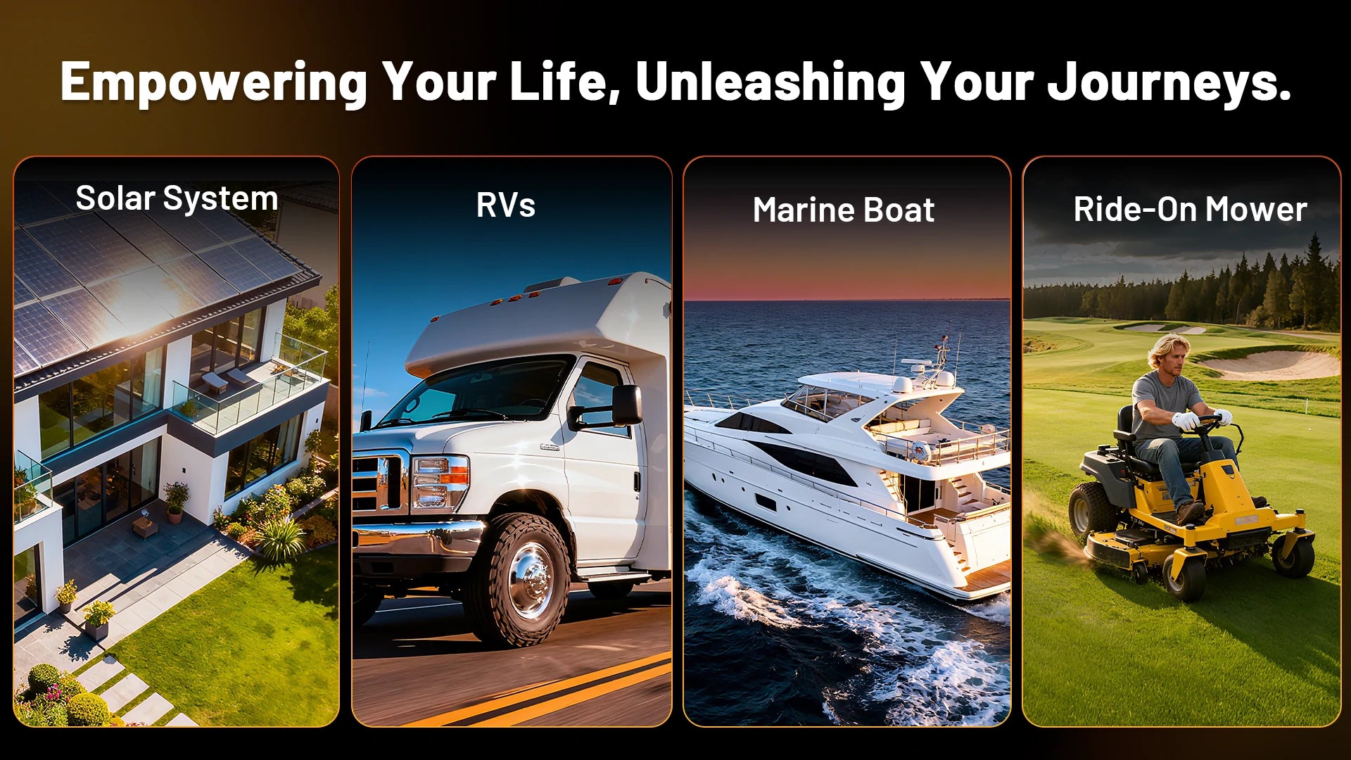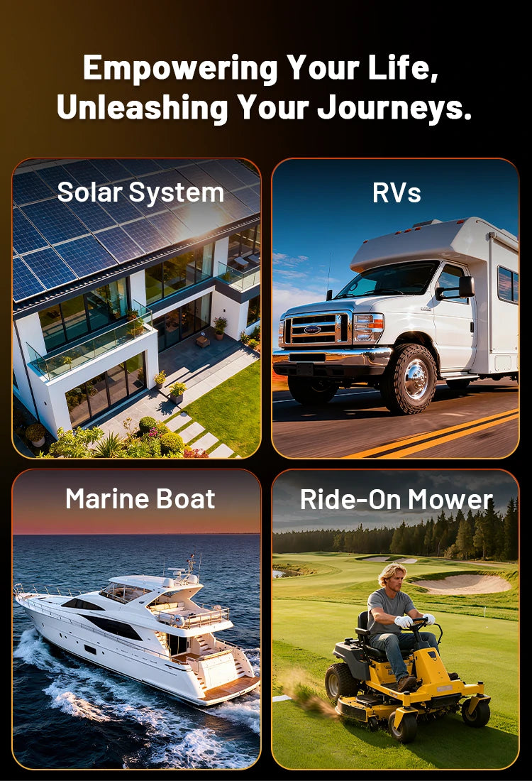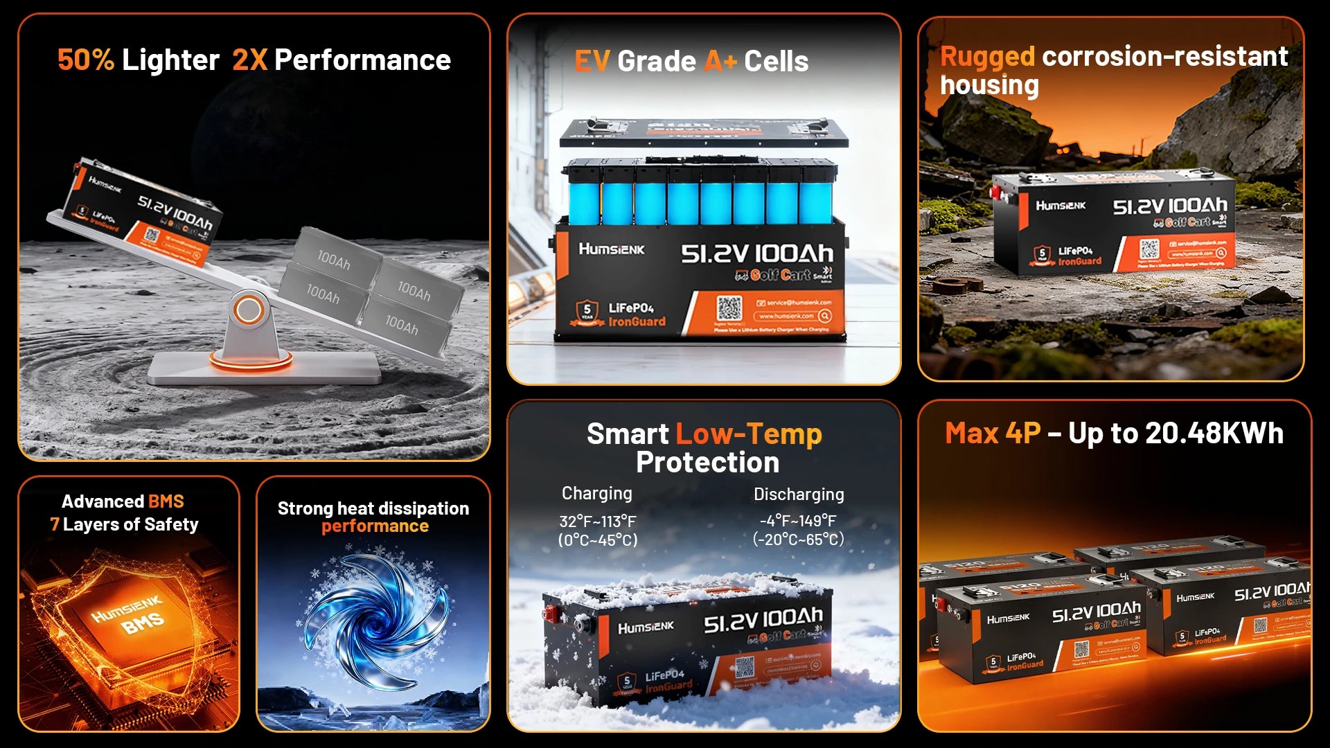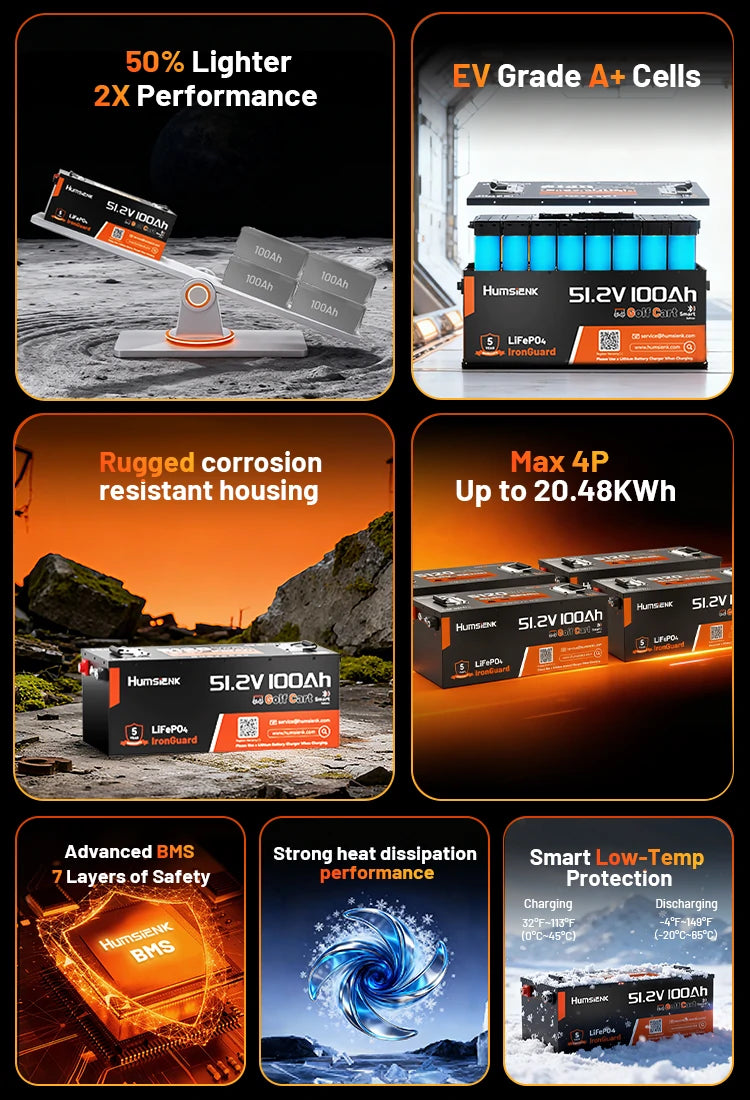 - 62% Lighter & 23% Smaller than 4*12V 100Ah lead-acid, no complex wiring connection, no regular maintenance.