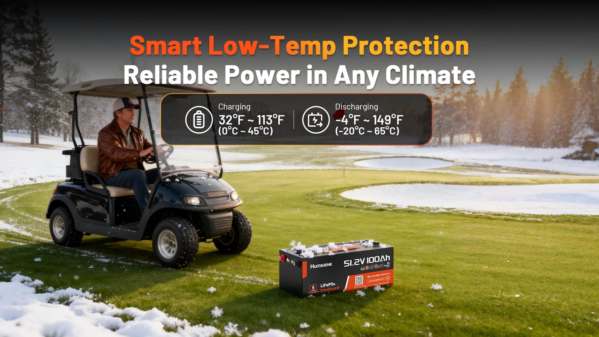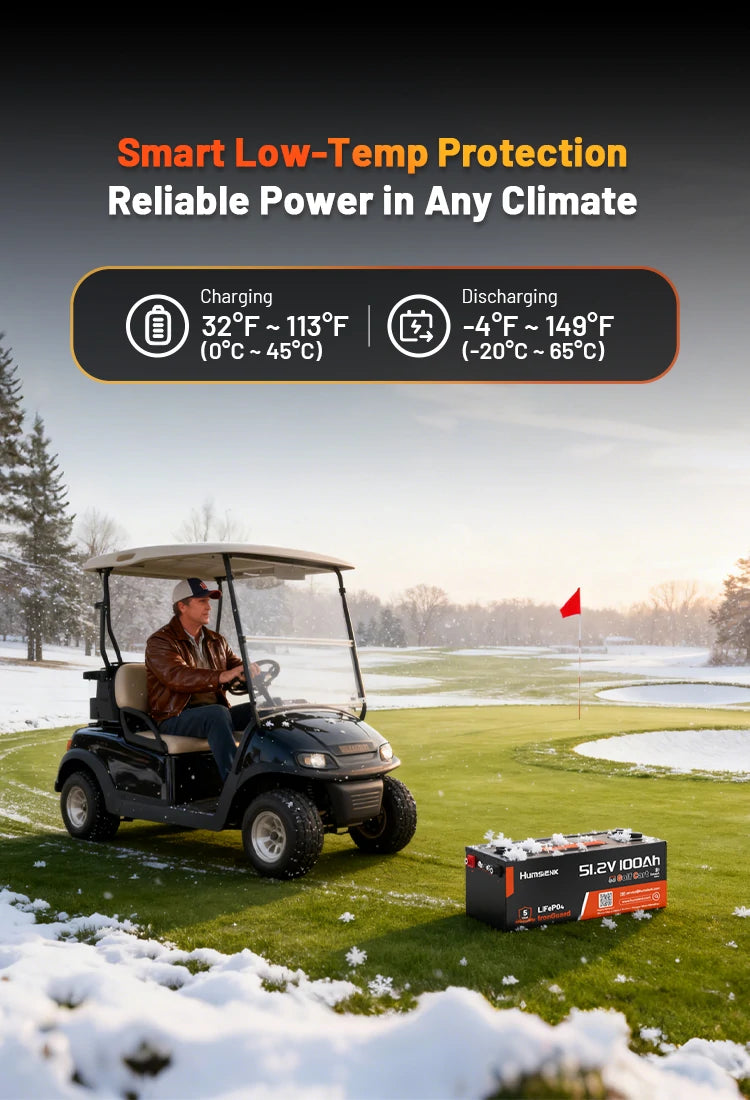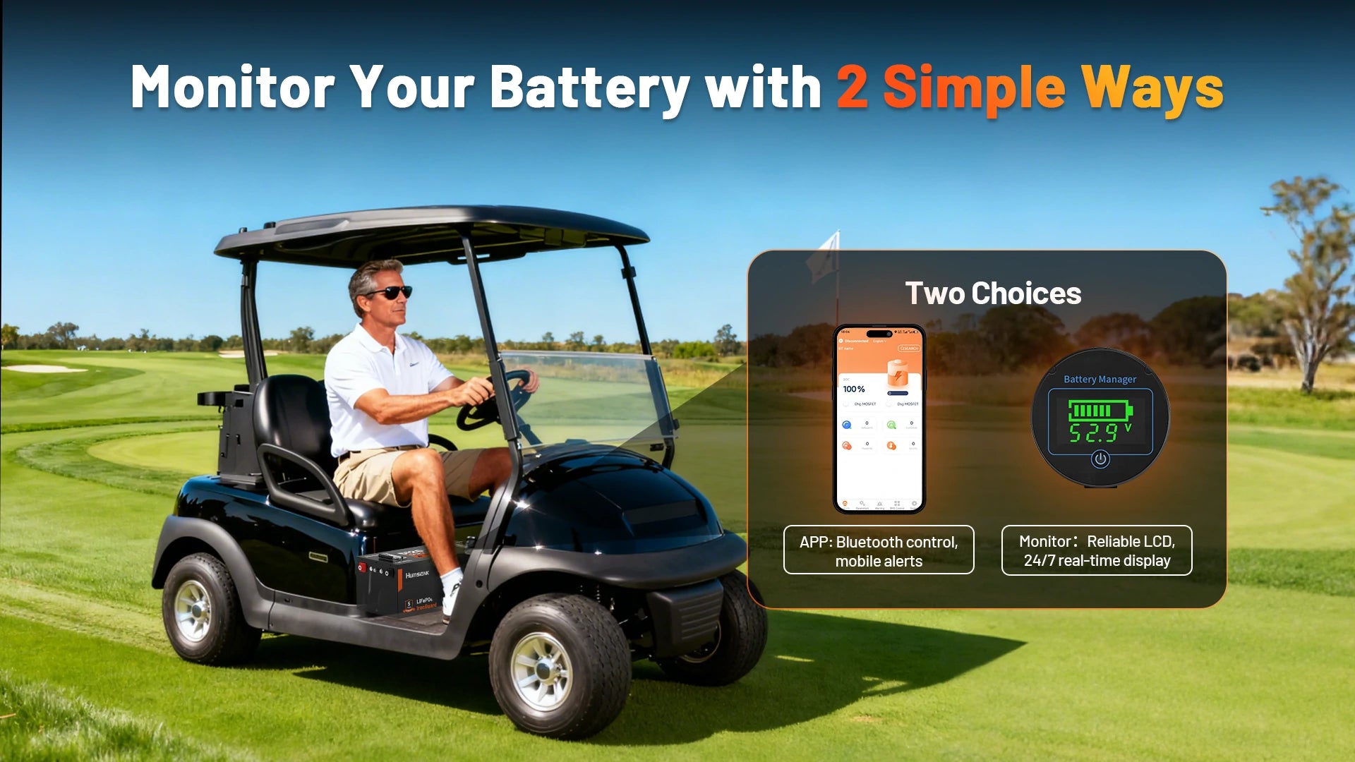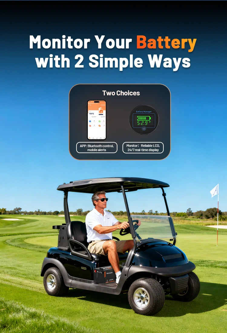 - Strong 200A BMS: 2C Cont. discharge rate, and has over-discharge/over-charge/over-current/over-load/over-voltage/over-heat, actively protecting your golf cart and battery.
