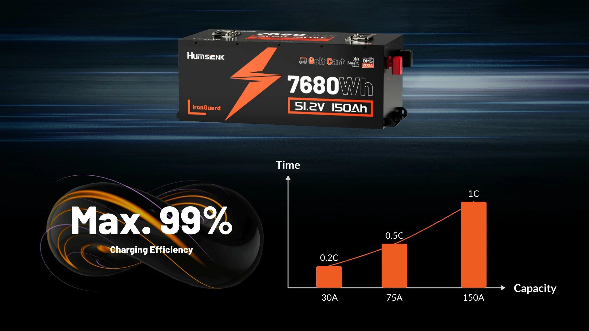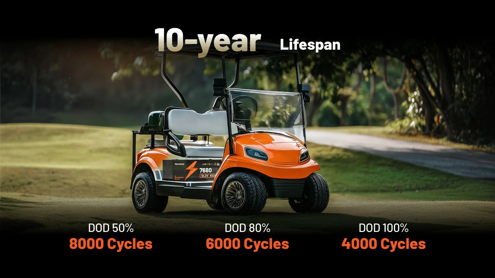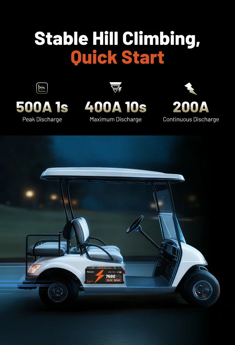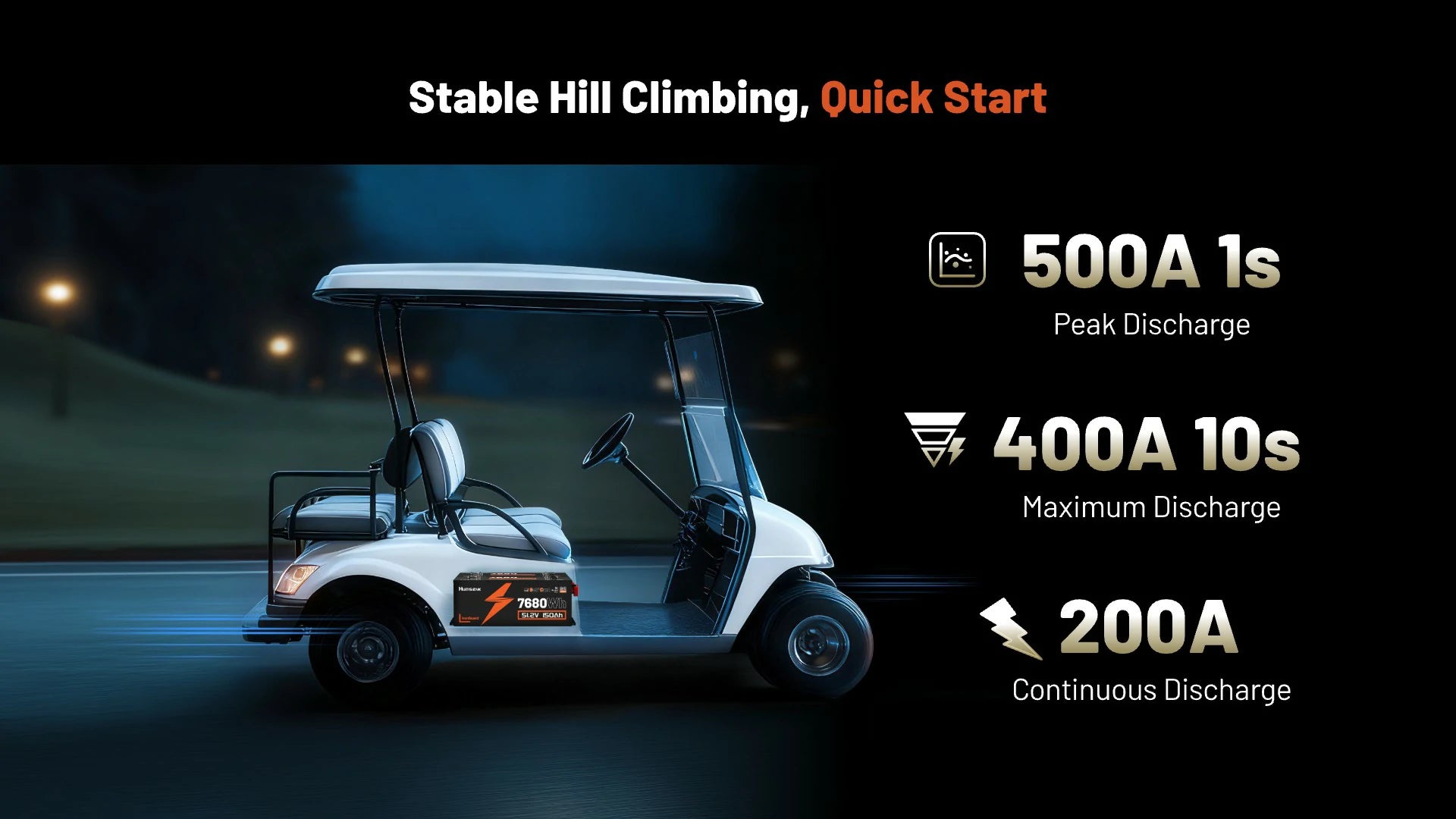 It enables stable hill climbing and quick start, with excellent discharge performance: 500A peak discharge (1s), 400A max discharge (10s), and 200A continuous discharge. It handles various golf course terrains easily.