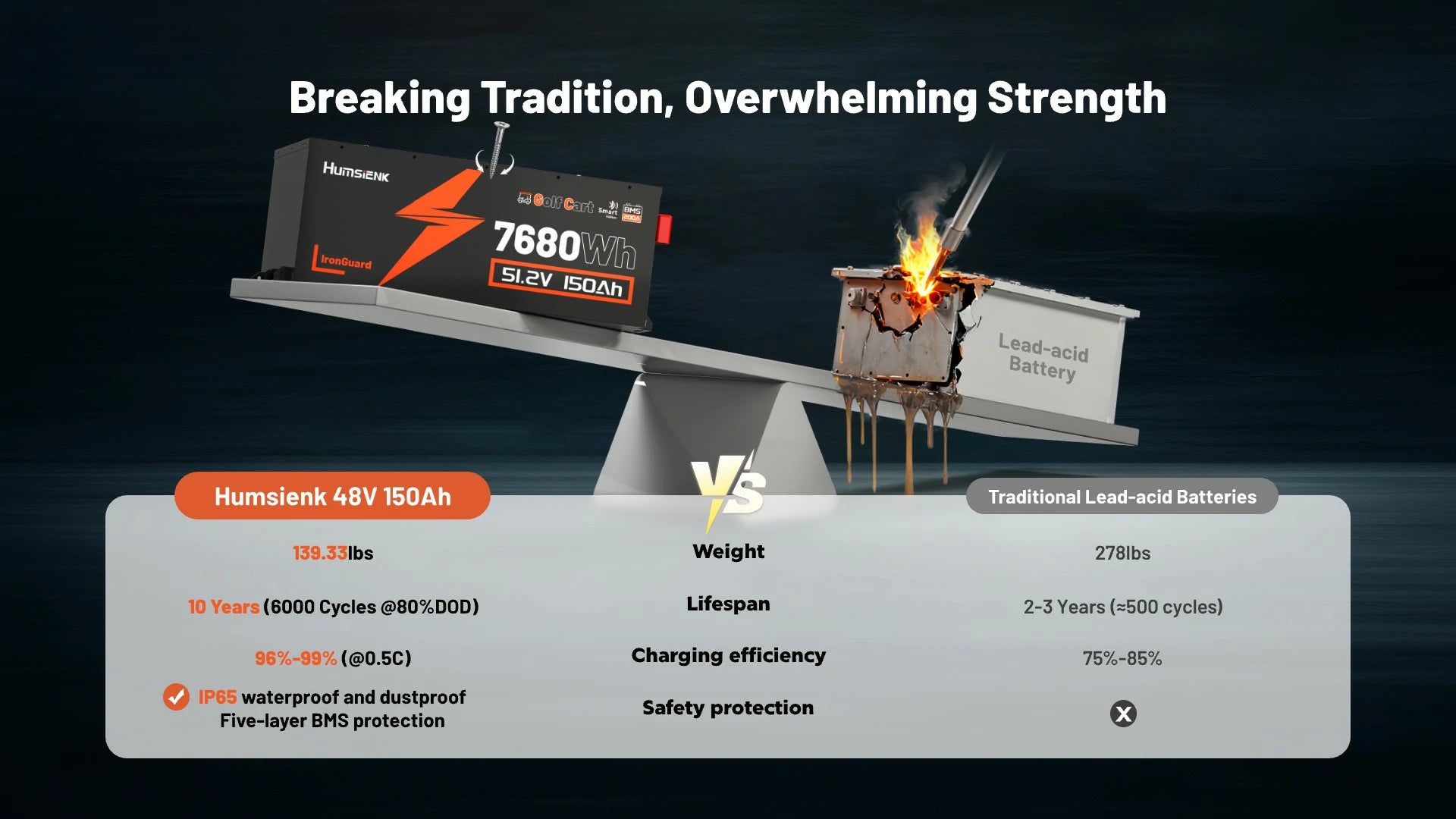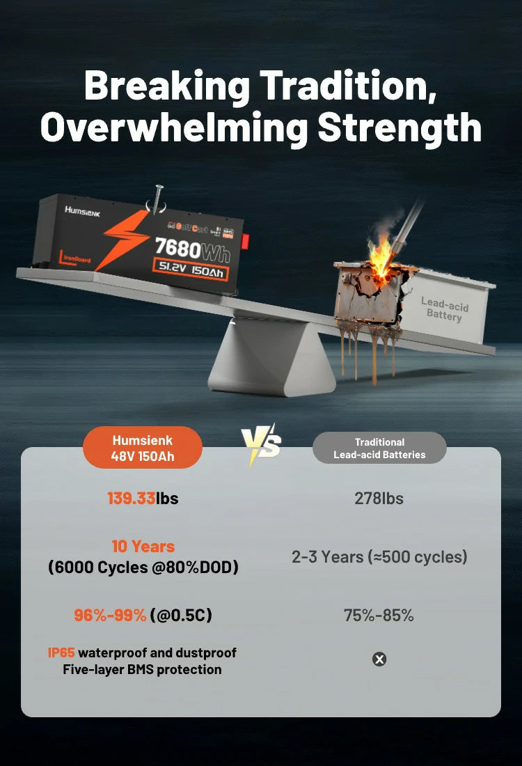Compared to traditional lead-acid batteries, it has clear advantages: 139.33lbs (vs 278lbs), 10-year lifespan (vs 2-3 years), 96%-99% charging efficiency, plus IP65 protection and 5-layer BMS—outperforming lead-acid batteries comprehensively.