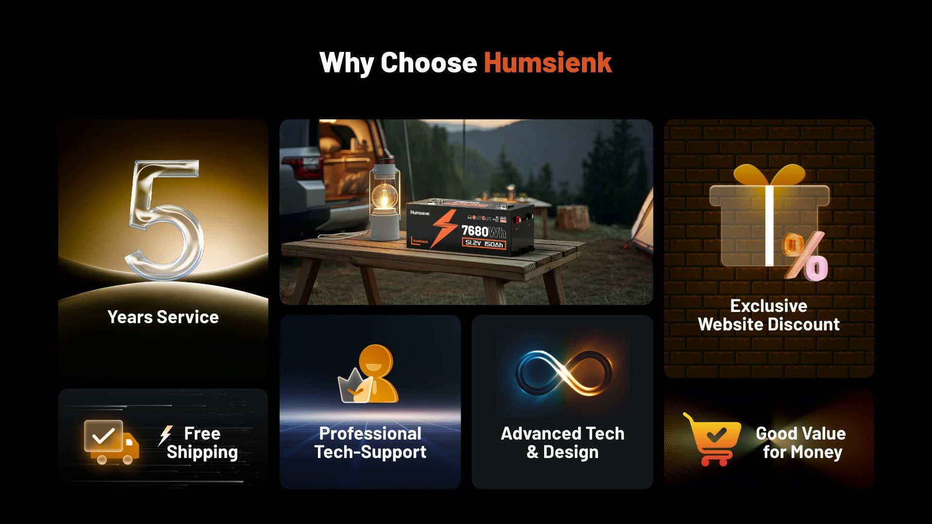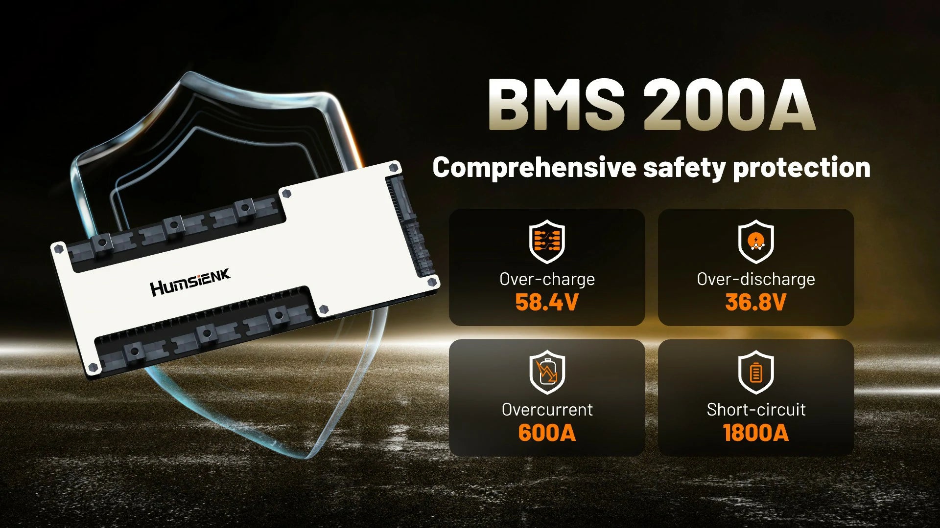 Fitted with a 200A BMS, it offers comprehensive safety protection: over-charge (58.4V), over-discharge (36.8V), overcurrent (600A), and short-circuit (1800A) safeguards. Multiple protections ensure worry-free usage.
