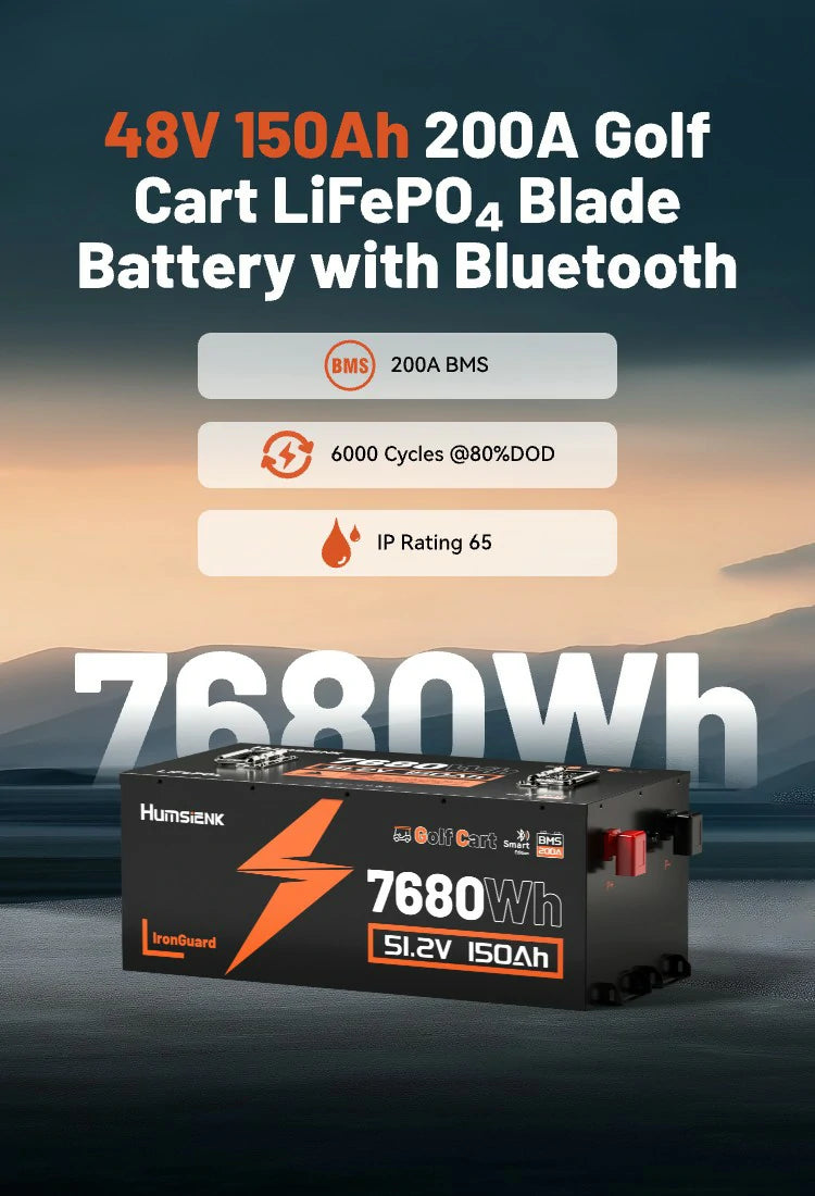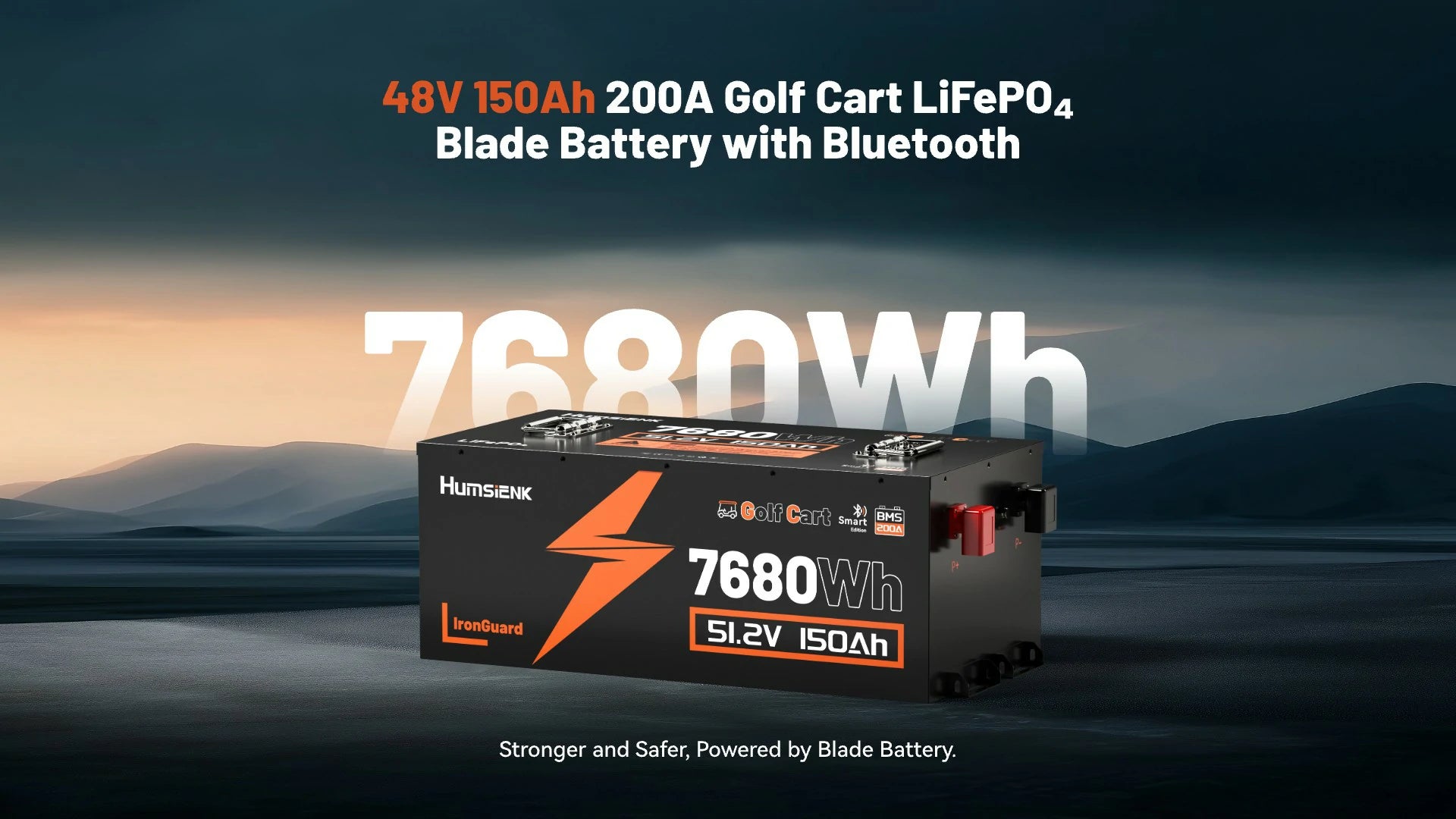 This 48V 150Ah 200A LiFePO4 blade battery (with Bluetooth) is built for golf carts, boasting 7680Wh of energy. Powered by blade battery tech, it’s stronger and safer—an excellent power choice for golf carts.