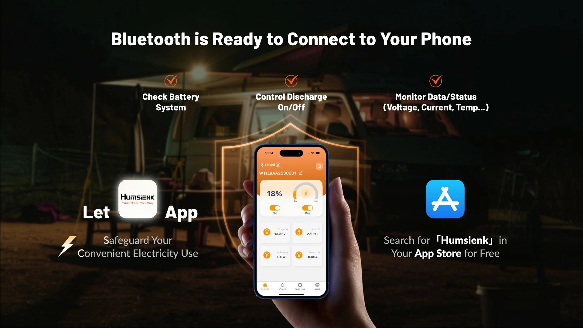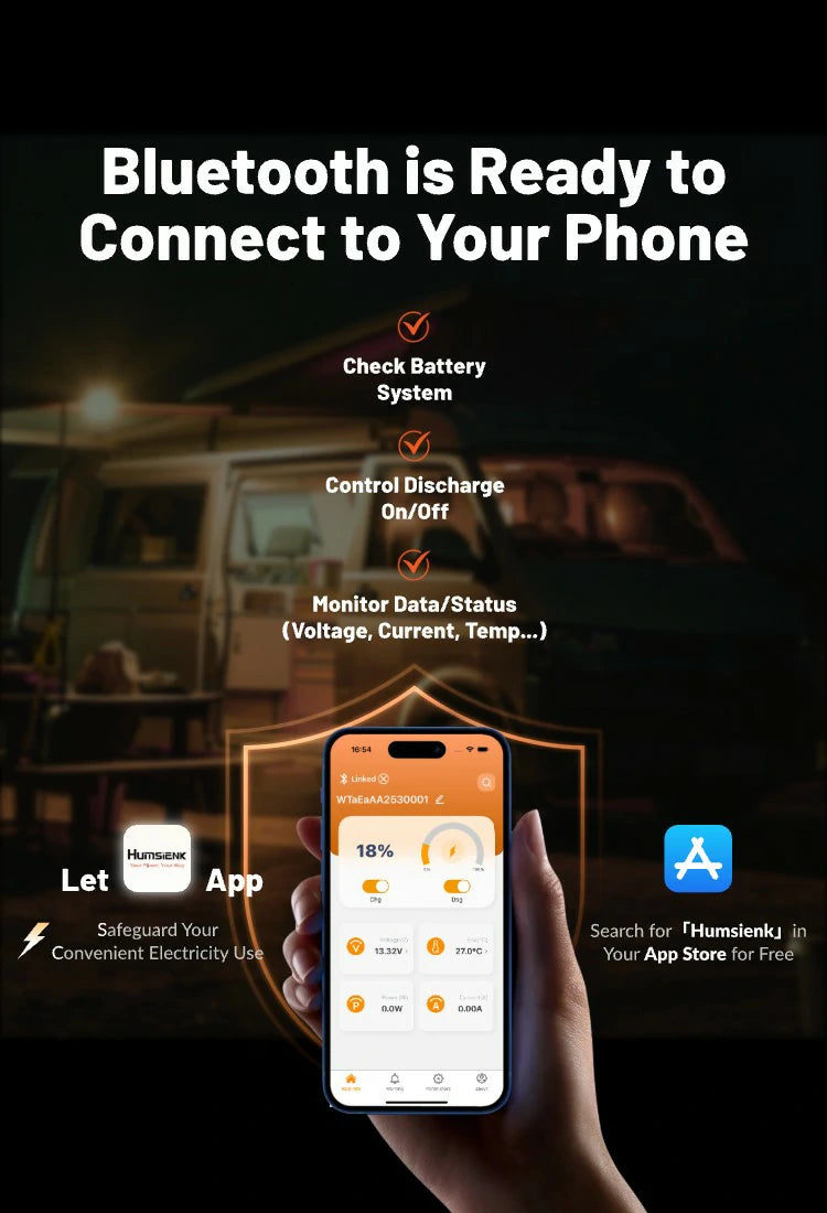 2. 200A intelligent BMS protection system: Covers overcharge, over-discharge, over current, short circuit, and high/low temperature five-layer protection, paired with UL94V-0 housing material, safer for outdoor use.