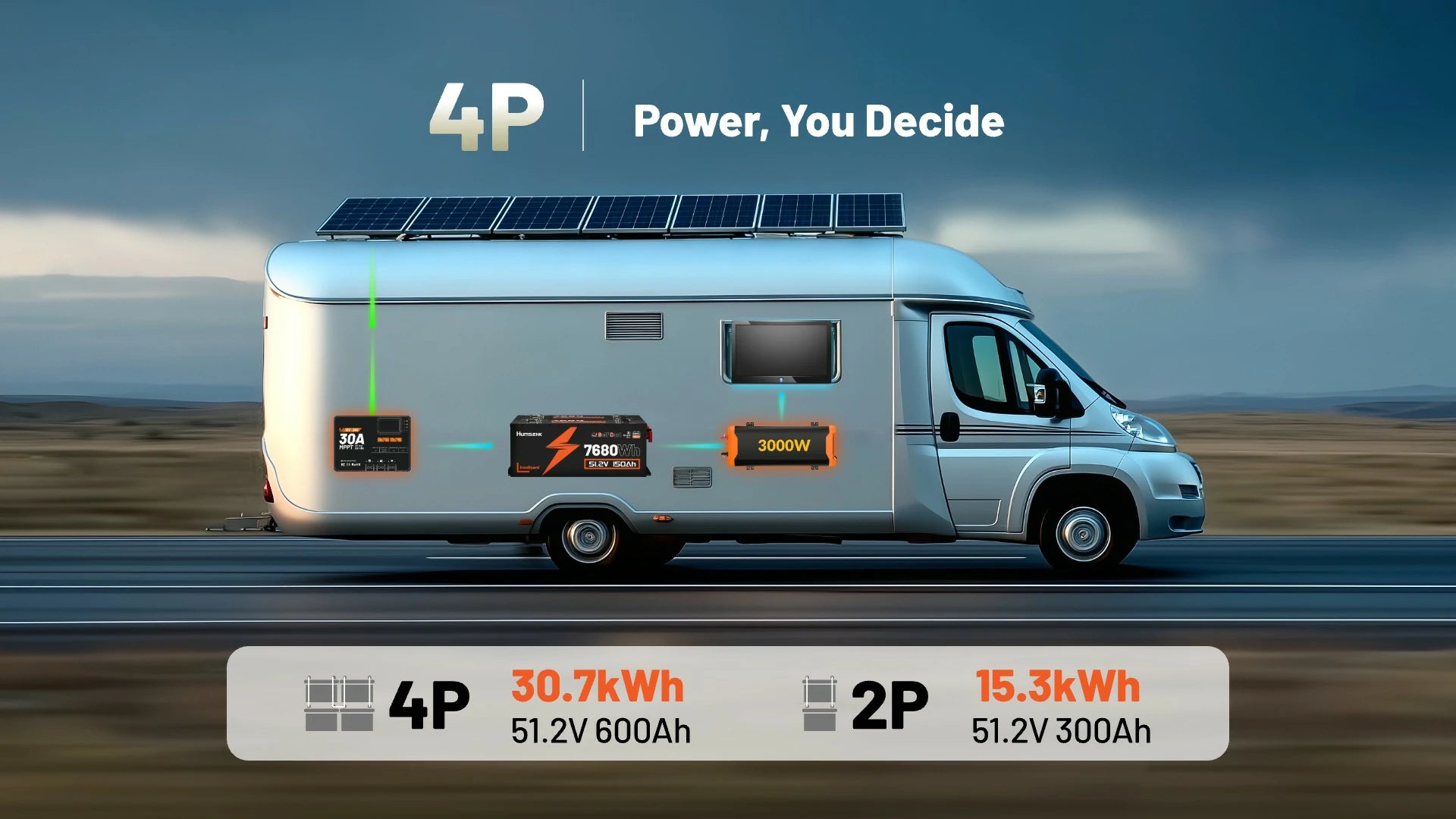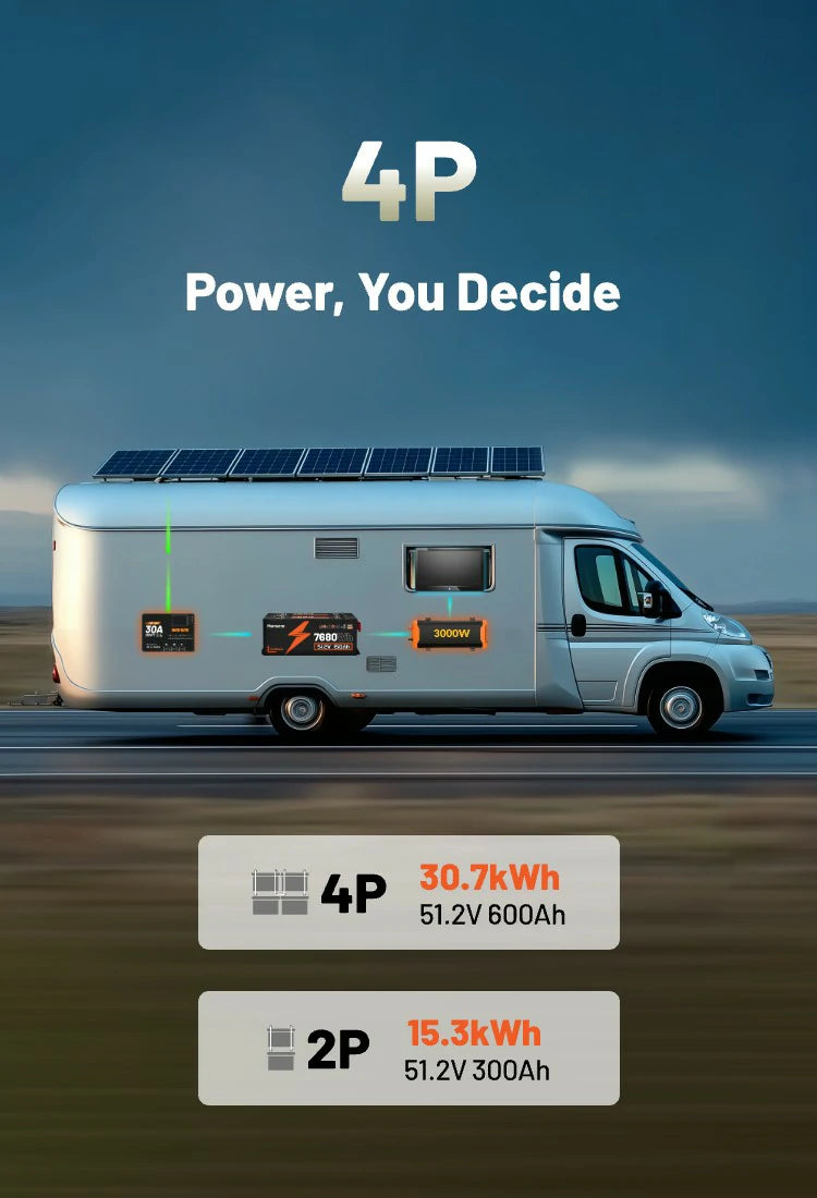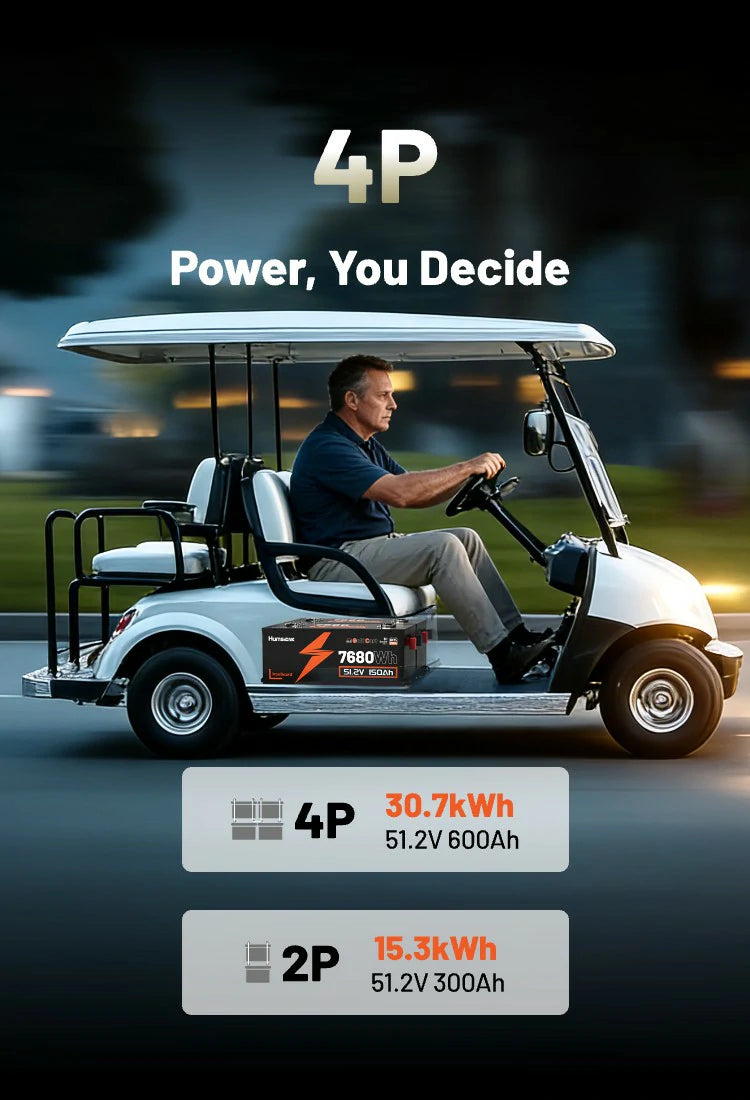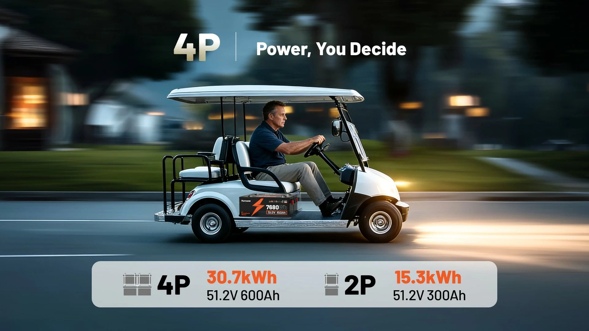 This battery supports flexible combinations—you decide the power: 4P (51.2V 600Ah) delivers 30.7kWh, while 2P (51.2V 300Ah) offers 15.3kWh. It fits different power needs for scenarios like golf carts.