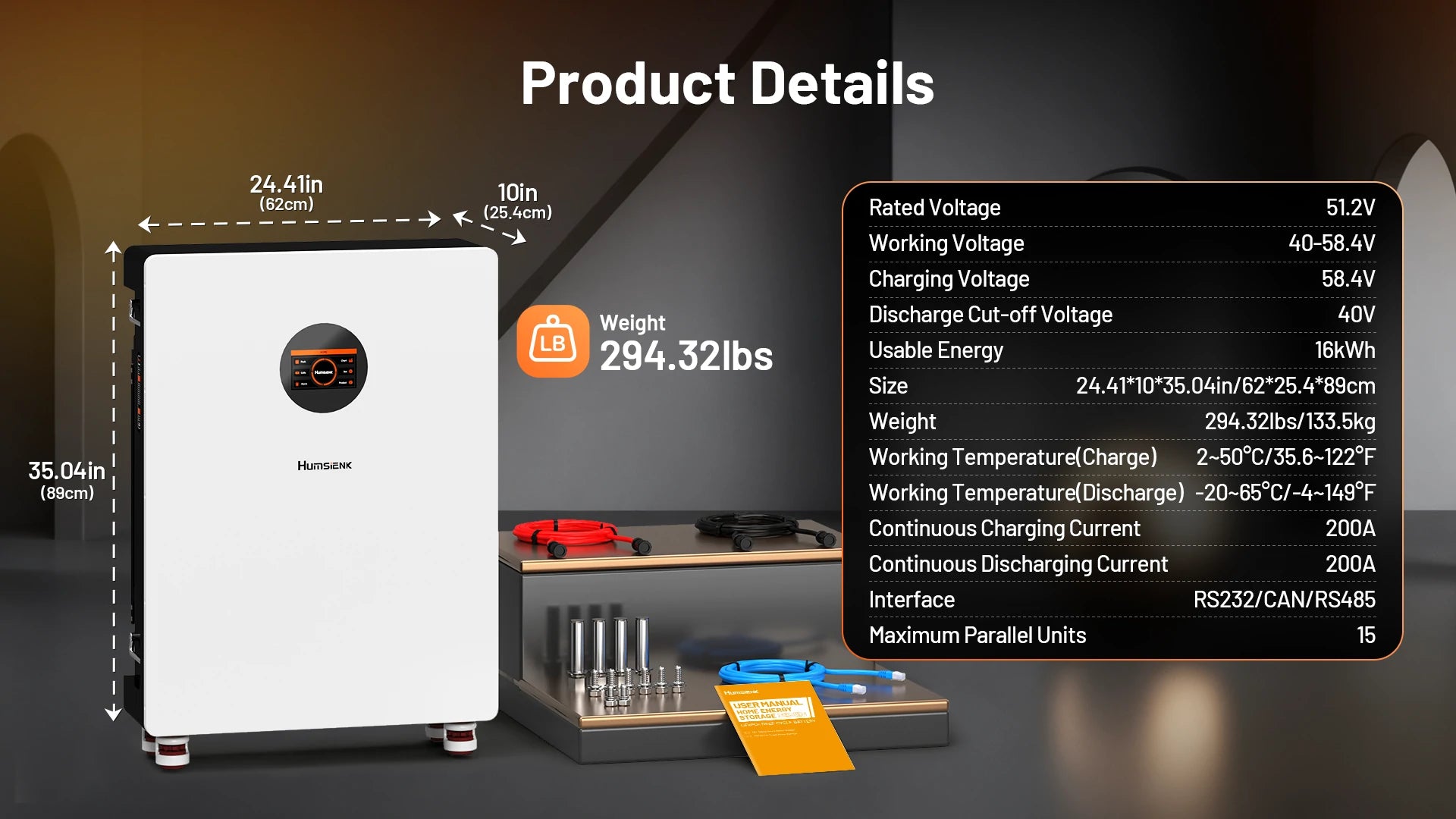 - 24.40 x 10.00 x 35.04 in | 294.0 lbs | 200A BMS