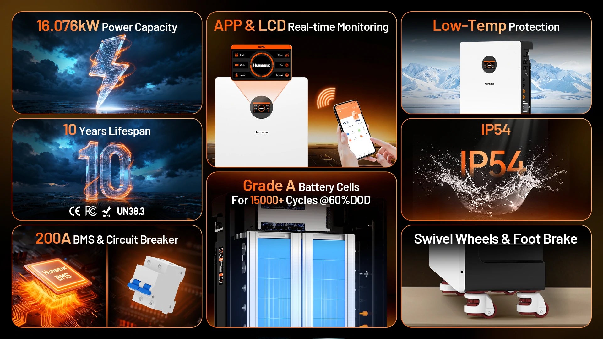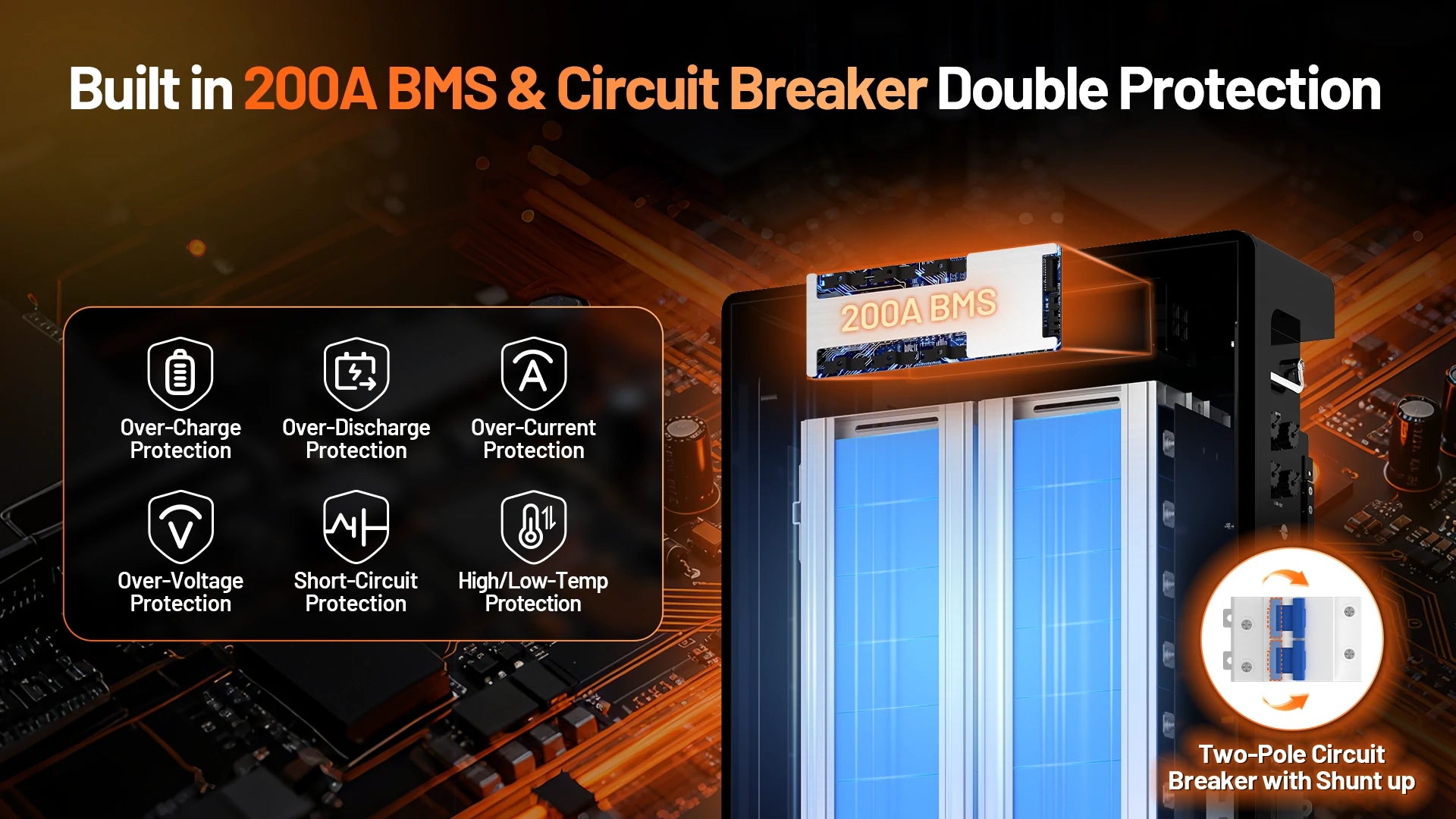- Built-in 200A BMS & Comprehensive Safety: Our proprietary 200A Battery Management System (BMS) with circuit breaker and robust metal casing provide ultimate protection. It safeguards against overcharge, over-discharge, over-current, short-circuit, and overheating. A critical low-temperature charging cutoff (< -4°F) prevents damage in freezing climates, ensuring safety and longevity in all conditions.
