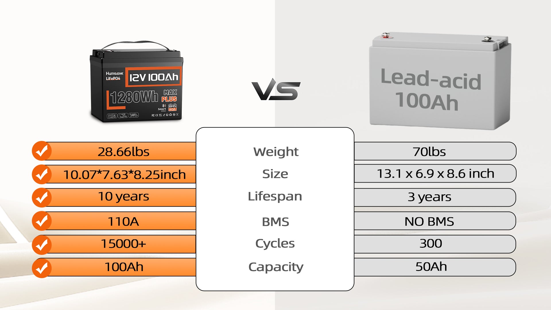 - Lighter: 28.66 lbs only, 54% lighter than 12V 100Ah lead-acid.